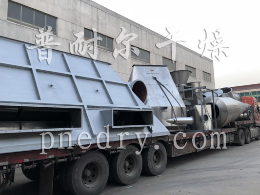 空气经加热后由主机底部进风切向进入主主塔,在主塔内形成类似龙卷风的高速旋转气流,同时根据不同的物料性质调整风量,使风速处于比较合适的状态,物料经螺旋加料器直接进入干燥塔,在高速气流的冲击和带动下迅速分散并随气流作高速旋转运动;对于比较大且潮湿的颗粒团,高速气流不足以使之粉碎并高速旋转,于是在重力作用下逐渐下落,当落到主机底部时,被底部设置的破碎装置强行破碎并微粒化,然后随高速气流一并旋转上升而完成一次干燥过程,并随气流进入旋风干燥进行二次干燥并完成整个干燥过程,经旋风除尘后进入包装袋入库,还有一部分没有下来微粉随气流进入脉冲布袋除尘全部回收,尾气随风机排放到大气层,排放标准达到环保要求。