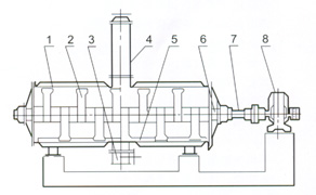 被干燥物料从壳体上方正中间加入,在不断正反转动的耙齿的搅拌下,物料轴向来回走动,与壳体内壁接触的表面不断更新,受到蒸汽的间接加热,耙齿的均匀搅拌,粉碎棒的粉碎,使物料内的水份气化,在真空系统的作用下,使被干燥物料内部水份和表面水份更有利的排出,气化的水份经干式除尘器、湿式除尘器、冷凝器,从真空泵出口处放空。